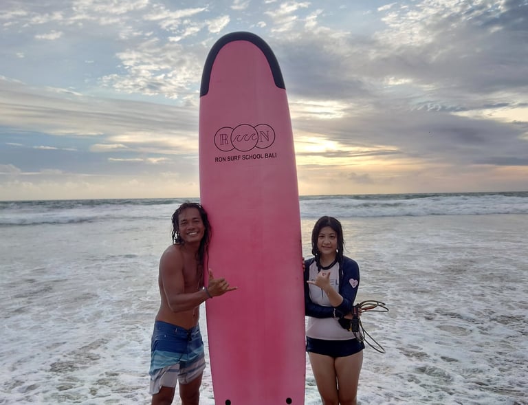 Experience quality surf lessons at Ron's Surf School in a friendly, safe environment on Legian Beach.